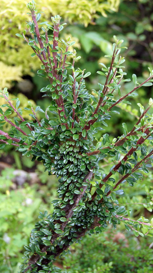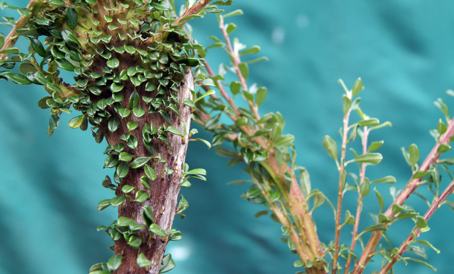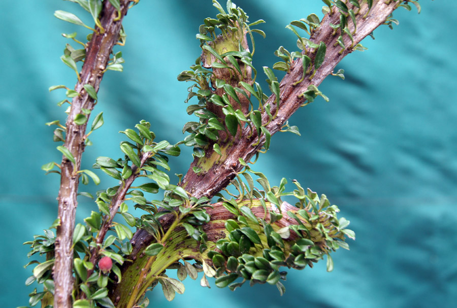 Un paio di anni fa mentre osservavo un mio cotoneaster che trapiantai una decina di anni fa su un’area della mia collina, notai alcune anomalie fra i giovani rametti che si svilupparono in un modo inconsueto. Infatti, nello stesso ramo c’erano dei germogli squamati, i quali non sembravano per niente sofferenti nel loro progredire. Incuriosito, cercai di fare un paio di talee prelevando il rametto dalle squame molto pronunciate. Sfortunatamente le talee non attecchirono, ma con la primavera del 2013 altri rametti presentarono queste anomalie dal portamento squamato. Decisi perciò di margottare il rametto “più caratteristico”, il quale si presentava molto sano, con foglioline più piccole ma con il tronchetto e i rametti primari completamente piatti e squamati.