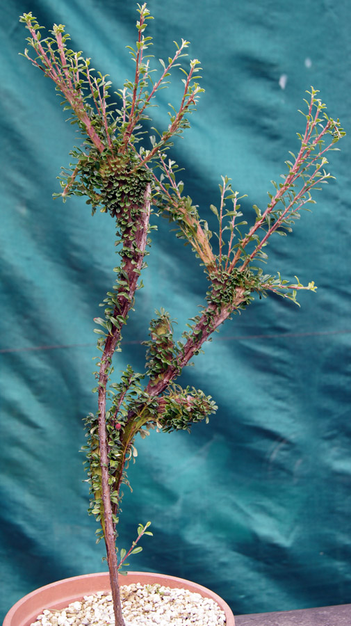 Dovetti attendere però la primavera di quest’anno (2014) per separare la margotta, la quale aveva prodotto sufficienti radici che garantivano la sopravvivenza del rametto. Trapiantai la margotta in un vasetto di plastica con un’alta percentuale di pomice, nebulizzando abbondantemente con acidi umici e fitostimolanti ormonali le radici, la parte aerea della piantina ed anche il terriccio. Dopo la separazione della margotta il cotoneaster non ha avuto problemi, sviluppandosi regolarmente mantenendo costantemente le caratteristiche squame sul tronco e sui rametti.