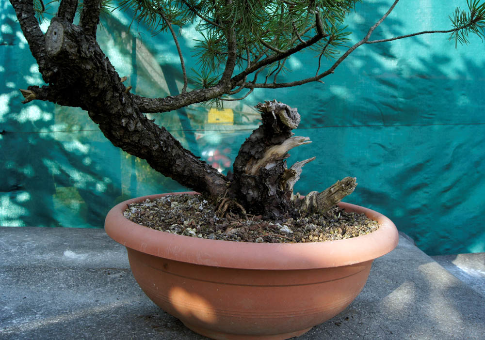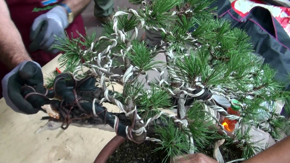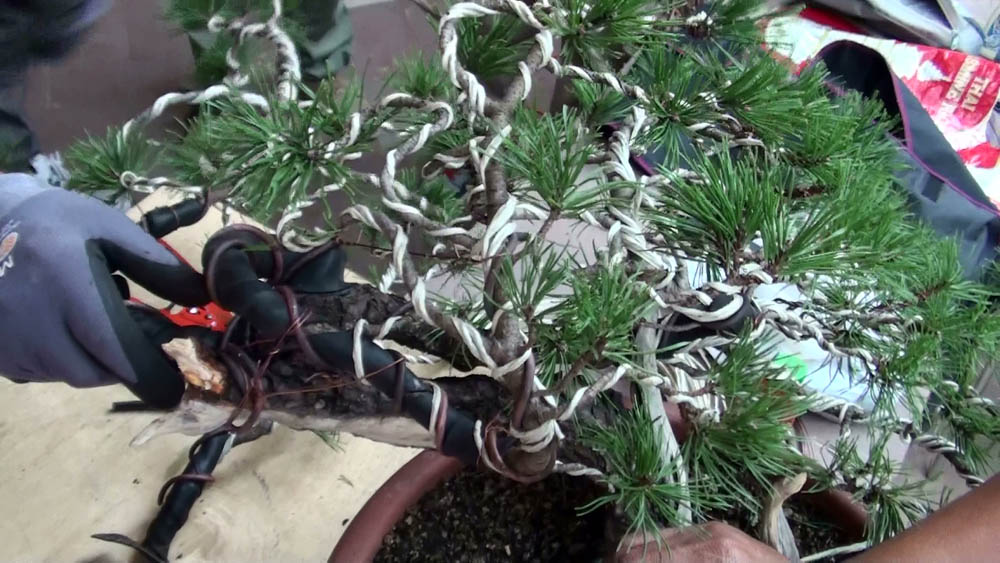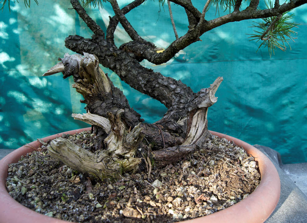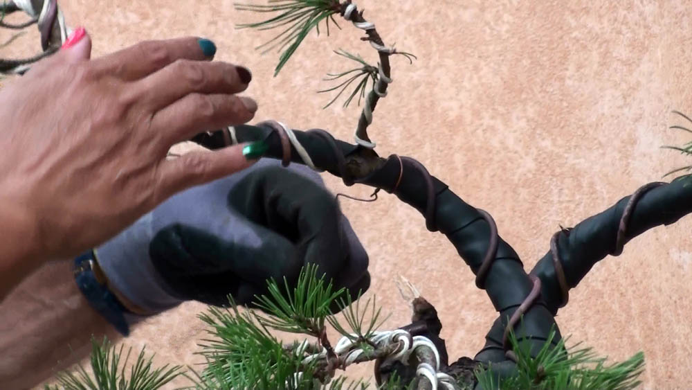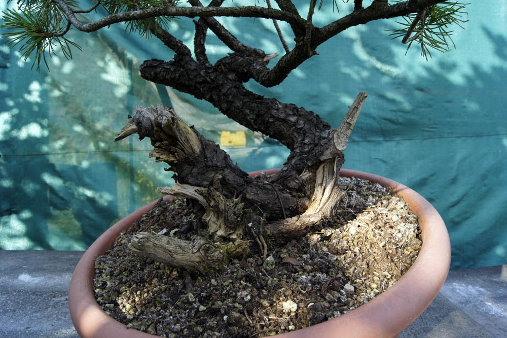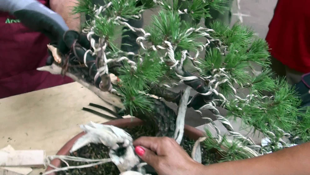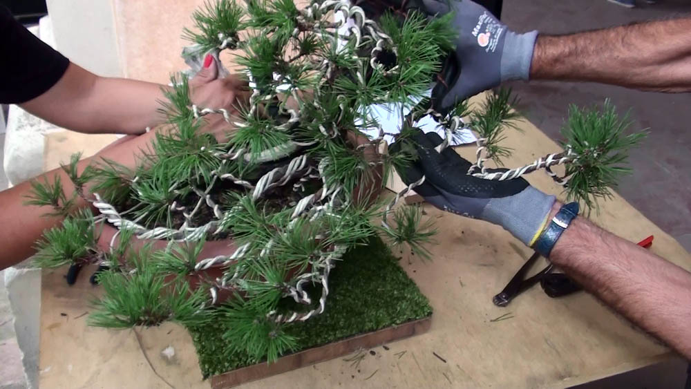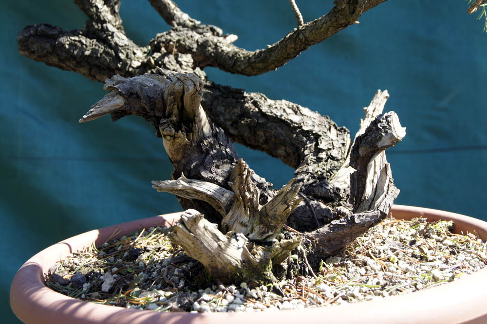 Le tecniche che ho usato per la lavorazione di questo pino mugo sono stati principalmente dei tagli circolari con un coltello affilato, incidendo i rami fino alla zona del cambio, rivestendoli successivamente con delle strisce di gomma. Questa mia tecnica consolidata mi permette di piegare rami molto vecchi e rigidi, inserendoli nella posizione desiderata.