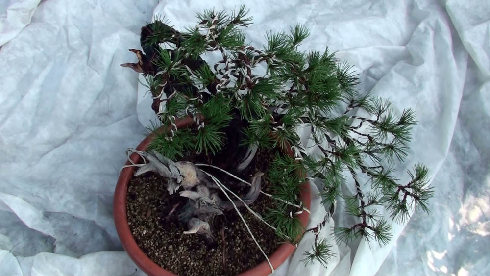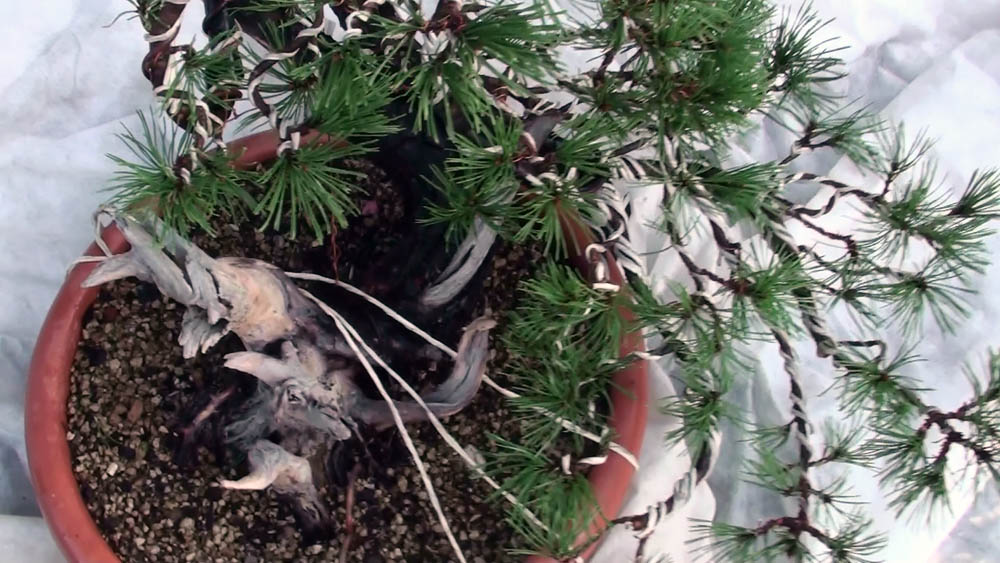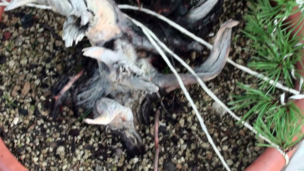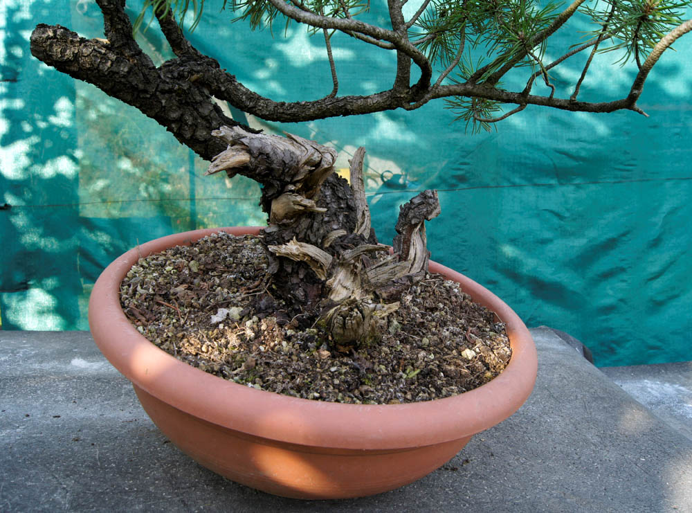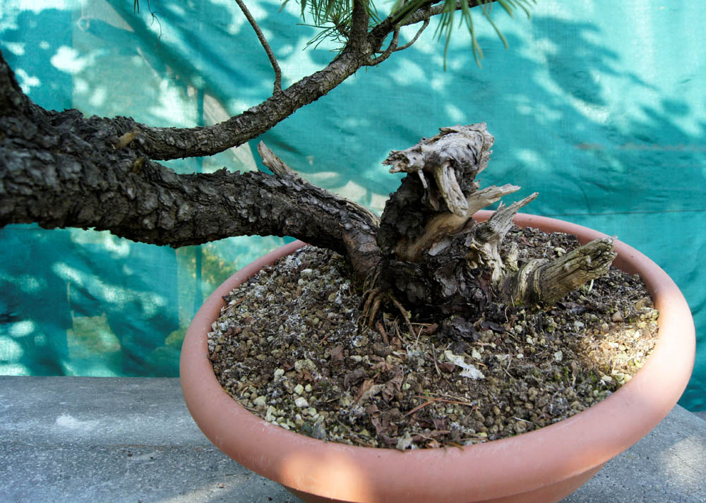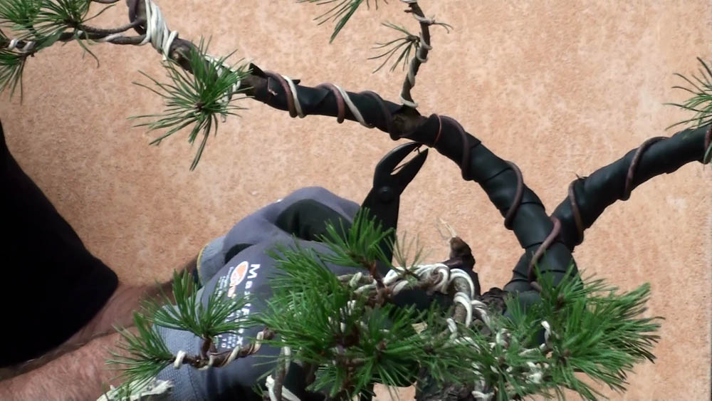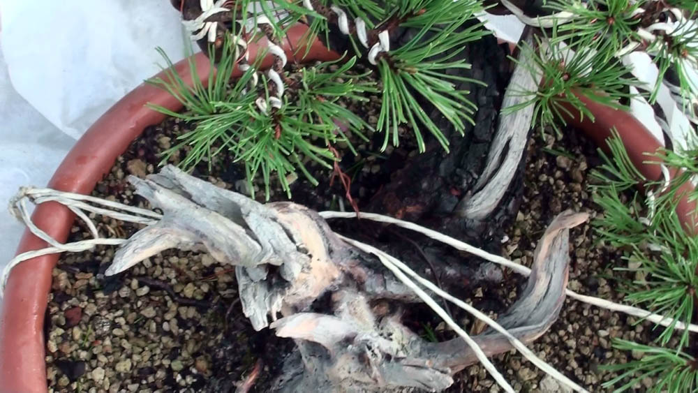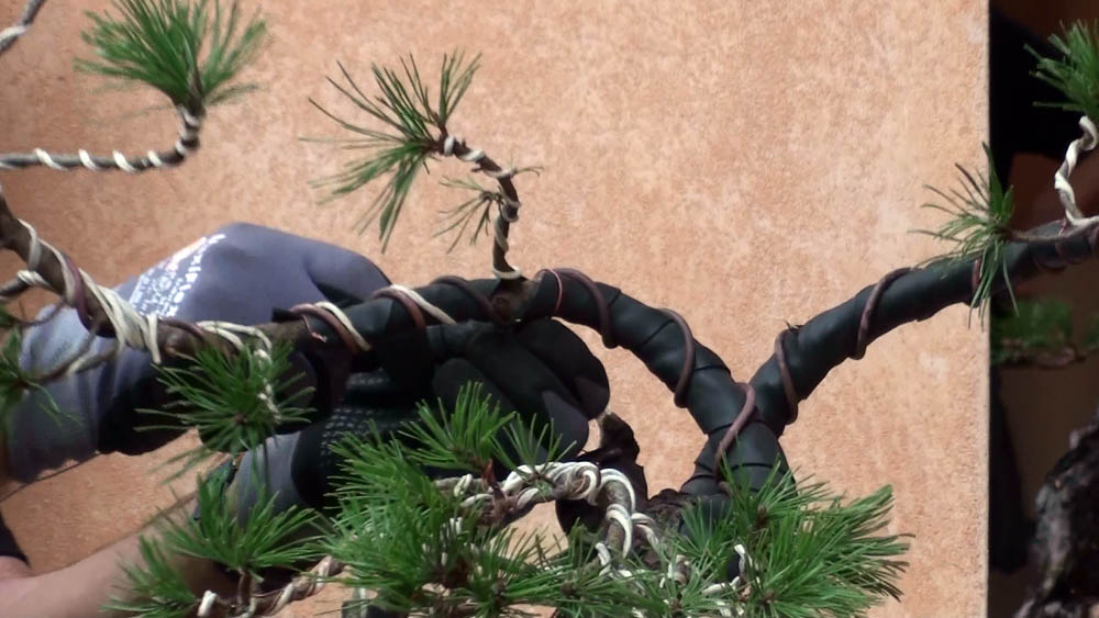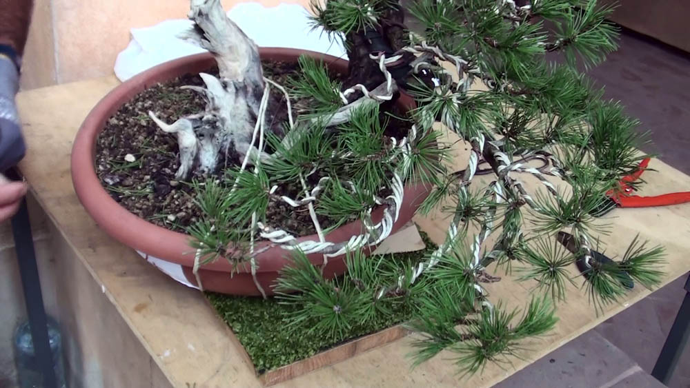 Le tecniche che ho usato per la lavorazione di questo pino mugo sono stati principalmente dei tagli circolari con un coltello affilato, incidendo i rami fino alla zona del cambio, rivestendoli successivamente con delle strisce di gomma. Questa mia tecnica consolidata mi permette di piegare rami molto vecchi e rigidi, inserendoli nella posizione desiderata.